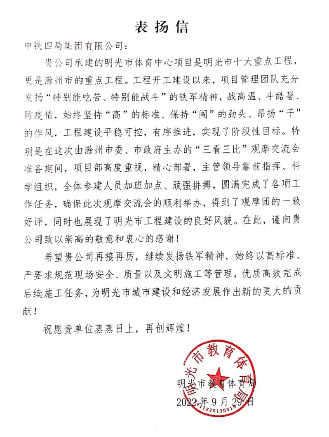 9月29日,明光市体育中心项目收到明光市教体局表扬信,信中对项目在滁州市三看三比重点工程现场观摩交流会明光市体育中心项目观摩点取得的成功表示祝贺和表扬,极大鼓舞了项目全体参建人员,表示将继续保持昂扬的 。