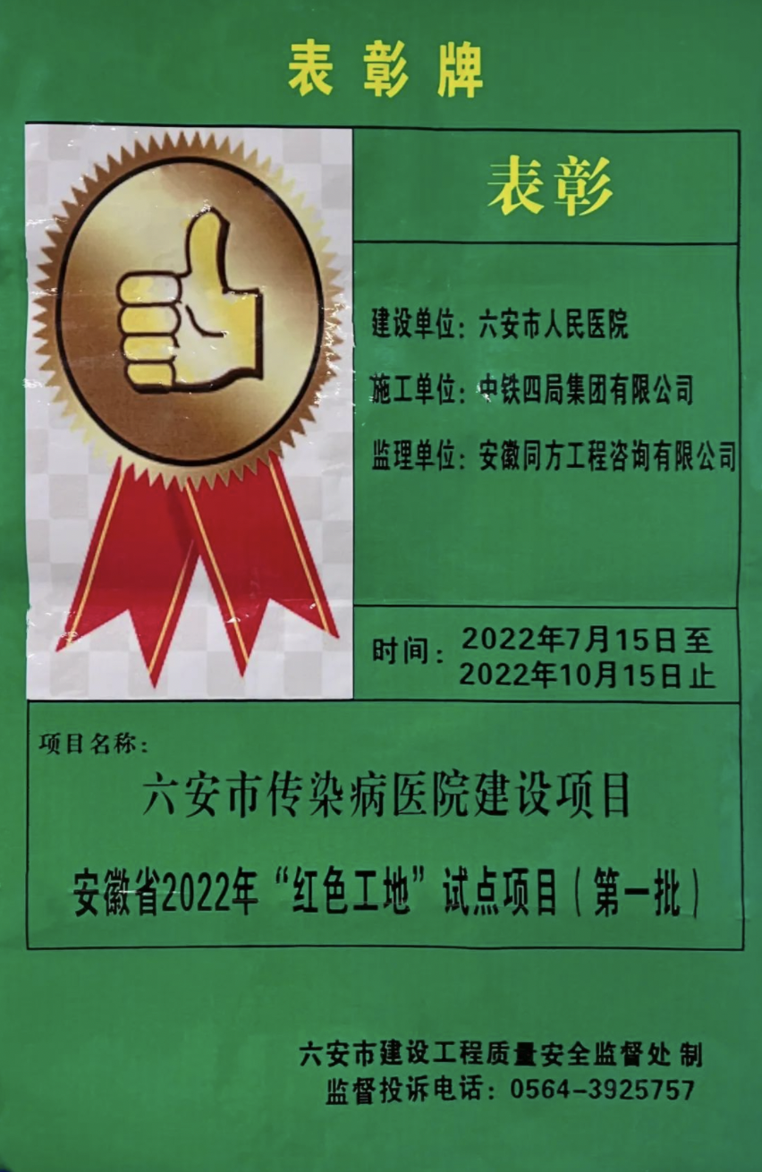 日前,中铁四局六安市传染病医院建设项目入选安徽省第一批红色工地试点项目,标志着项目红色工地创建工作取得阶段性成效。。
